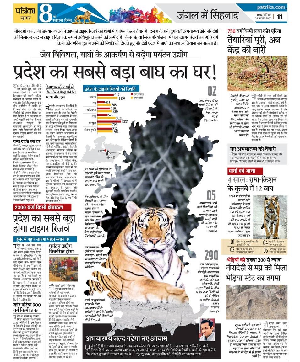 Nauradehi Wildlife Sanctuary is ready to get upgraded to Tiger Reserve. Nauradehi and Rani Durgavati Sanctuary, Damoh in combined form are expected to be notified as New Tiger Reserve by the Centre. Keeping in view the possible submergence of 900 sq km core area of Pann...